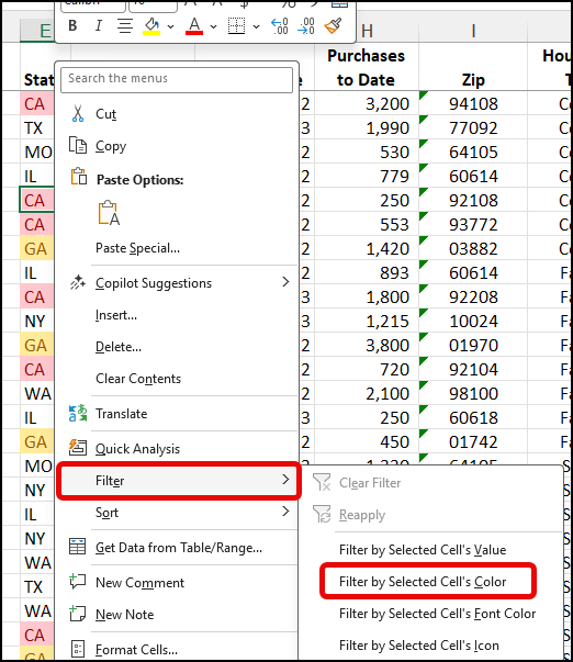If your spreadsheet uses color coding, right-click a colored cell and choose Filter > Filter by Selected Cell's Color. Excel instantly shows only rows matching that background color — useful when cells are conditionally formatted.