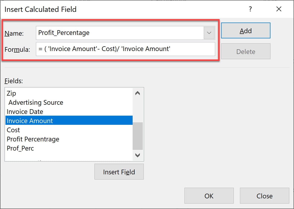 3. In the Name box, type a name for the field. 4. In the Formula box, enter the formula for the field. 5. Click Add.