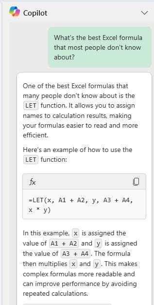 One such formula is LET, which allows you to assign names to calculation results. This can simplify complex formulas and improve readability. Ask Copilot about the best Excel formulas that are under the radar, and you'll be introduced to functions like LET that can redefine how you work with data.