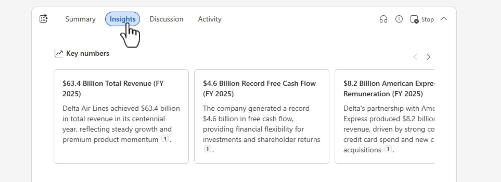 The Discussion tab pulls in any comments that have been added to the document. If multiple people have worked on the file, you will see all their comments summarized here. In this example, I added a comment requesting more details about Atlanta, and Copilot surfaced it as a discussion point.