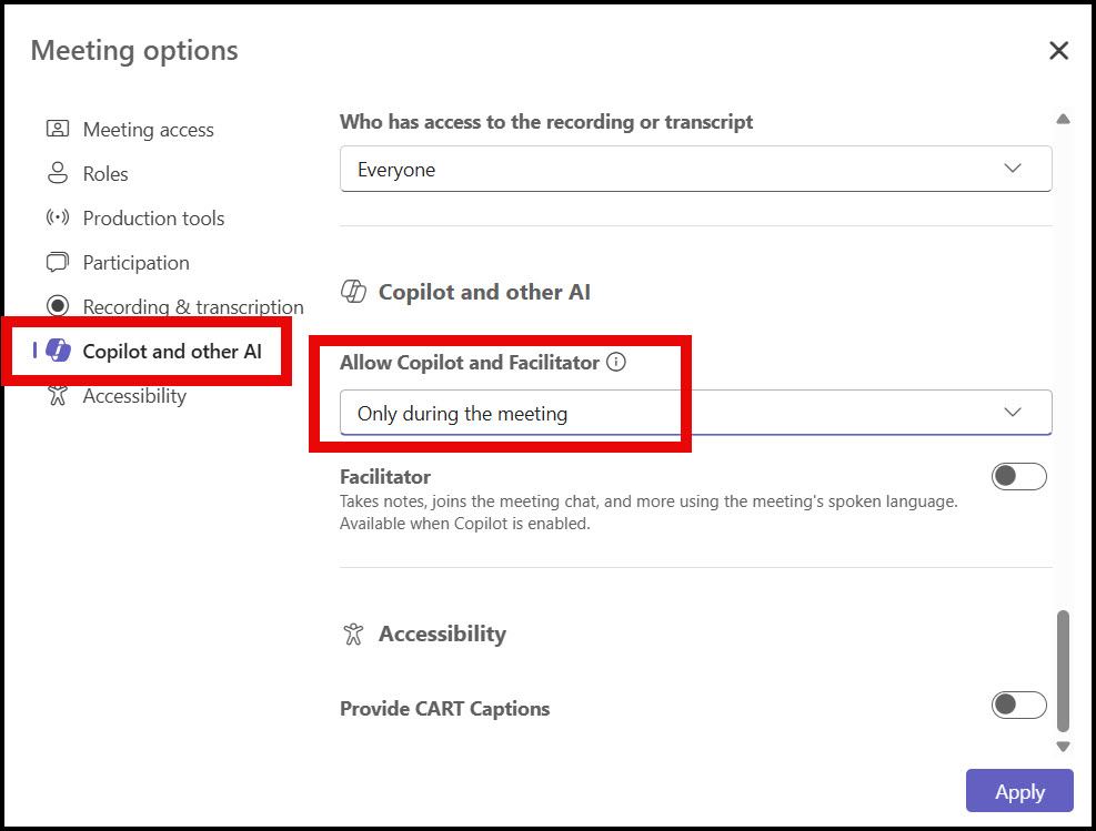 The setting you want is the "only during a meeting" option for Copilot access. It allows Copilot to run during the live meeting without enabling transcription or recording. Here’s how I set it up when I’m the meeting organizer: