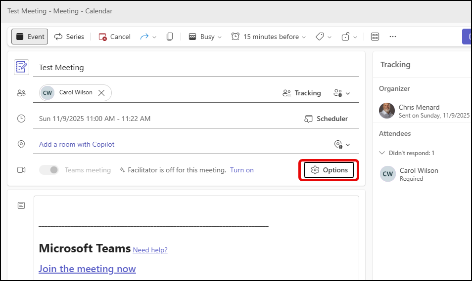 - When creating a Teams meeting (an Event), click Options (image below).