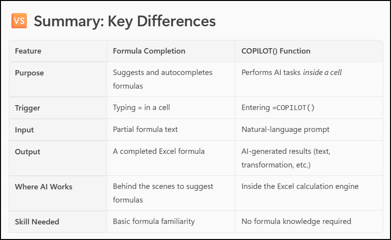 Excel FORMULA Completion vs COPILOT(): When to Use Each Feature