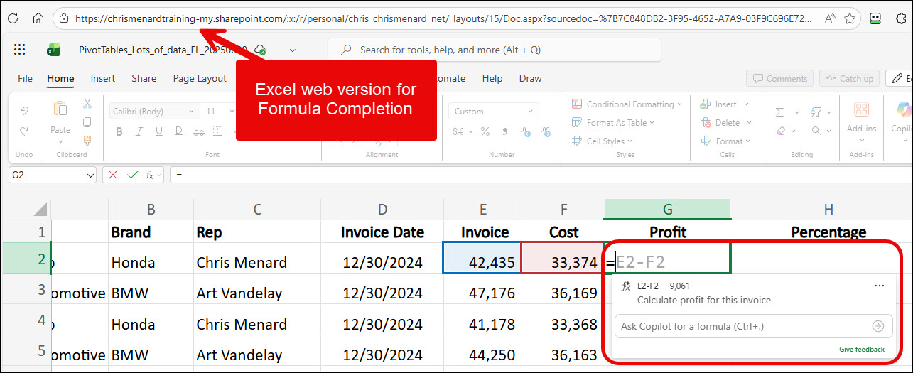 - License requirement: You need an M365 Copilot license for the Copilot function to work, and for Formula Completion to work.