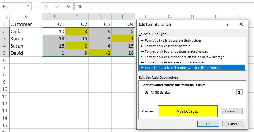 1. Select your range 2. Make sure you are on the **Home** Tab. 3. Click **Conditoinal Formatting,** then **New Rule.** 4. Click **Use a formula to determine which cells to format.** 5. Type **=B2=MIN($B2:$E2)** then click **Format** \- **Fill** tab - pick a color. 6. Click **OK**.