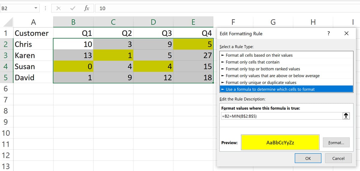 1. Select your range 2. Make sure you are on the **Home** Tab. 3. Click **Conditoinal Formatting,** then **New Rule.** 4. Click **Use a formula to determine which cells to format.** 5. Type **=B2=MIN(B$2:B$5)** then click **Format** - **Fill** tab - pick a color. 6. Click **OK**.