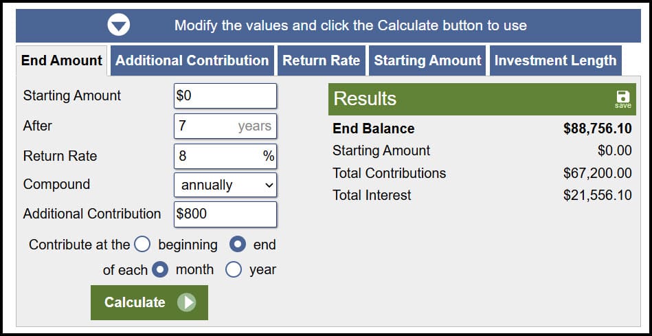 I validated this against an online investment calculator that compounds annually and allows monthly contributions. With zero starting balance, $800 monthly contributions, 7 years, and 8% annual return, the calculator gave a different result than the naive Excel formula. The corrected monthly-rate approach produced a perfect match.