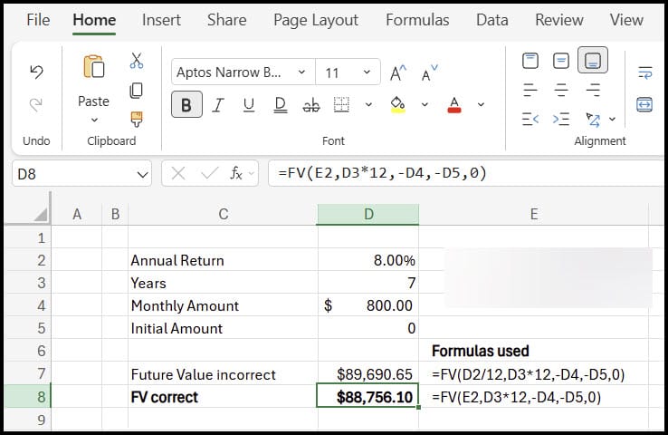 =FV(8%/12, 7*12, -800, 0, 0)That formula seems logical, but it assumes the annual rate simply splits evenly into monthly pieces without compounding. In reality, an annual return of 8 percent compounds throughout the year, so the true monthly return is slightly less than 8%/12. Over several years, that small difference compounds and changes the final value.