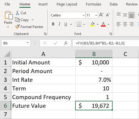 $10,000 invested at 7% interest for 10 years will be $19,672 in 10 years. Notice in this example, there are no peroidic payments. You invested the 10,000, and that is it.
