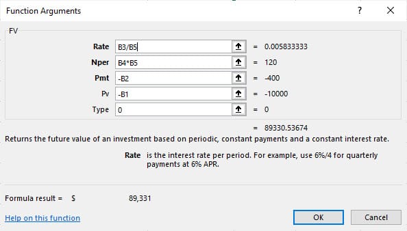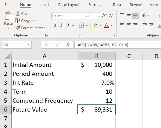 Similar to example 1, but now you are going to make the initial investment of $10,000, and you make regular investments of $400 every month at the end of the month. The interest rate is still 7%. Notice cell B5 is now 12 instead of the number 1. It is 12 since there are 12 months in a year, and you are investing $400 every month.