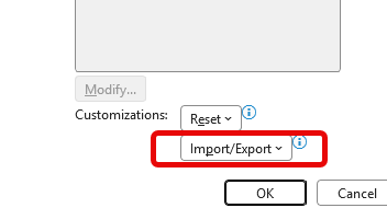 At the bottom of the customization dialog, click Import/Export and choose Export all customizations. This saves a .exportedUI file containing your toolbar and ribbon customizations. Save it to OneDrive for the safest backup — that way, you can access it from any machine.