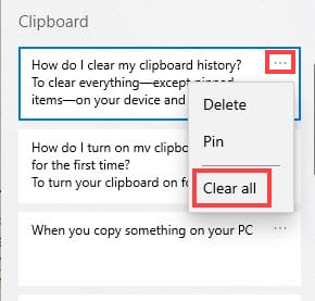 To clear everything—except pinned items - open your clipboard with **Windows logo key + V** and then click the click the **three dots** and select **Clear All**.