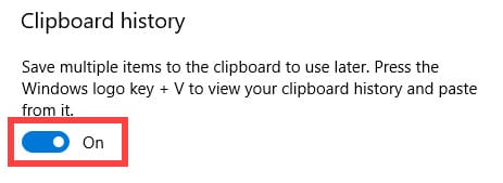 To turn your clipboard on for the first time, select **Windows logo key + V**, and then select **Turn on**.