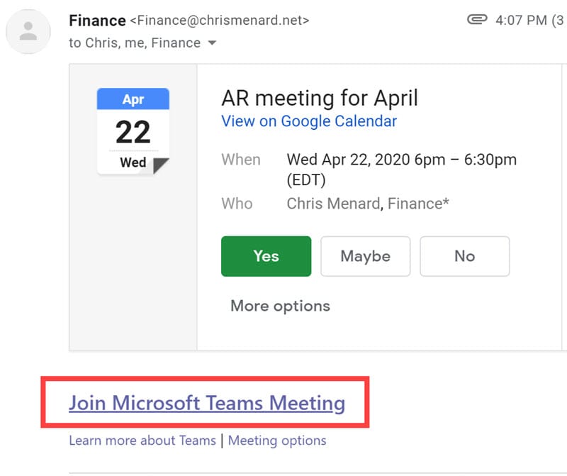 After receiving an emial, the guest can either join the meeting from their calendar, if they said yes they were attending, or click **Join Microsoft Teams Meeting** from the email.