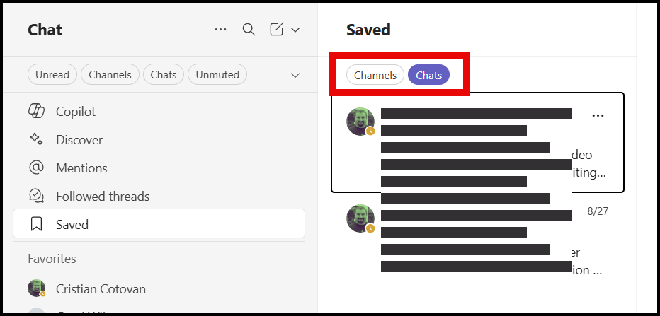 - Use the filter to separate personal chat saves from team channel saves when preparing for a meeting or follow-up.