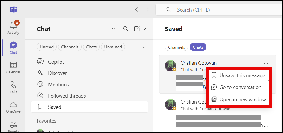 - Manage saved items — Open conversation, unsave, or open in a new window.
