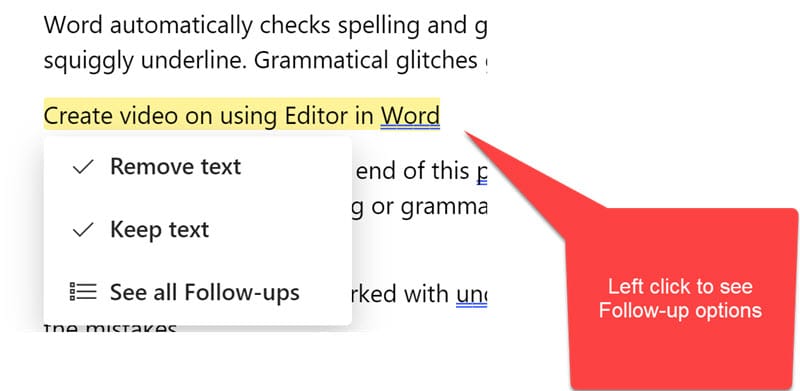 1. Remove text 2. Keep text 3. See all Follow-ups which opens the Navigation pane
