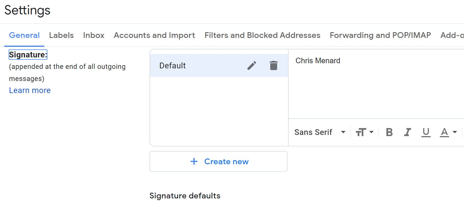 5. Name the new signature and click **Create**. 6. Type your signature information, format it. 7. Click **Save** at the bottom of the window.