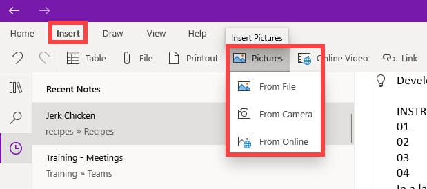 Method 1 - In OneNote, you could click Insert and then Picture.