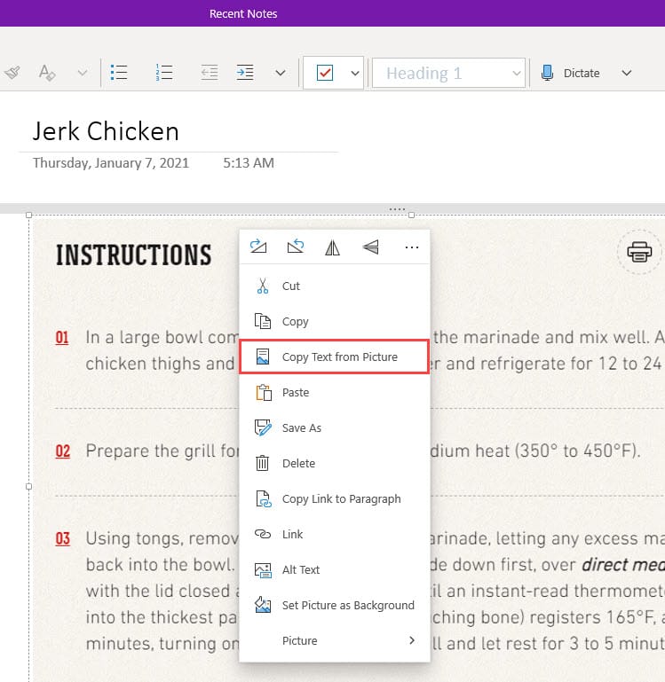 Microsoft OneNote allows you to copy the text from a picture or image. OneNote supports Optical Character Recognition (OCR), which allows you to copy text from an image or picture and paste it on your notes or another application, like Word or Outlook, so you can edit the text. Another incredible feature on OneNote and OCR is the text in the picture is searchable!