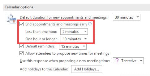 1. Click **File**\- **Options**. 2. Click **Calendar** on the left. 3. Under Calendar Options, select **End Appointments and Meetings Early**. 4. Change the times for meeting less than 1 hour and meetings for over 1 hour.