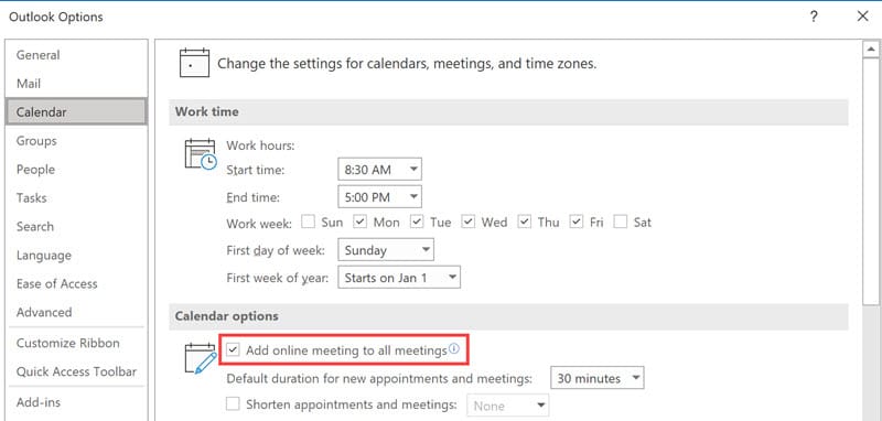 1. When you get this feature in Teams, you may need to enable it. 2. To enable it, open Outlook, click **File**\- **Options**\- **Calendar Options.** 3. Make sure **Add online meeting to all meetings** is checked.