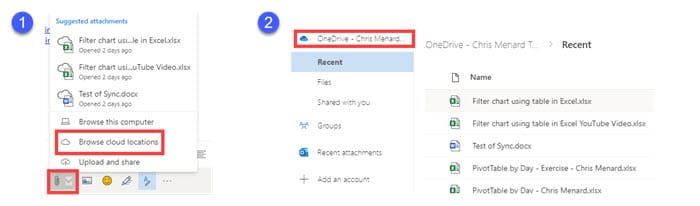 1. Compose a new email message. 2. Click the paperclip and select Browse cloud locations (screenshot 1). 3. OneDrive pops up, and you can select from Recent, Files - which shows you folders, Share with you, and Recent Attachments (screenshot 2). 4. Click Next after selecting your files. 5. Select either Share as OneDrive links or Attach as a copy.
