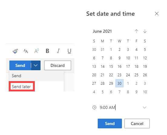Create a new email in Outlook on the web, click the arrow for Send and select **Send later.** Schedule a date and time (6/30/2021 at 9 AM is in the screenshot). Select **Send** an email will be in your drafts until it goes out.