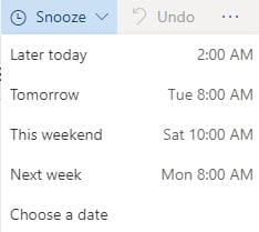 The Snooze feature allows you to select an email, maybe one you to answer later, and move it out of your inbox and have it show back up later automatically. Select the email you want to answer later, click Snooze, and select a date and time.