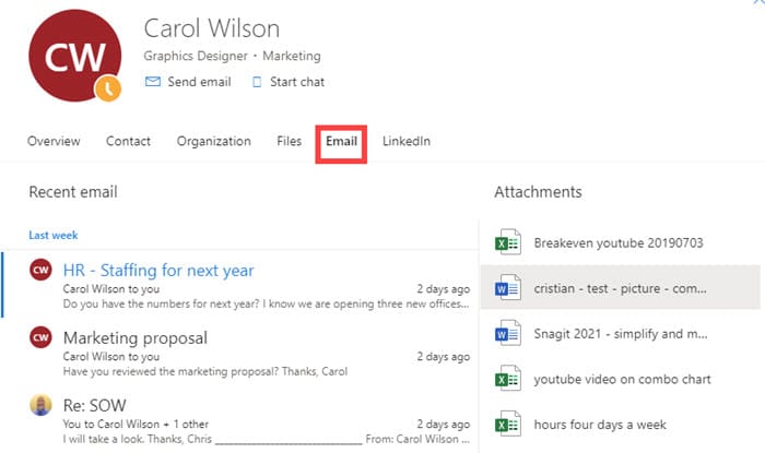 Want to know who someone reports to and see recent emails and files from that person. That is easy to do in Outlook on the Web.