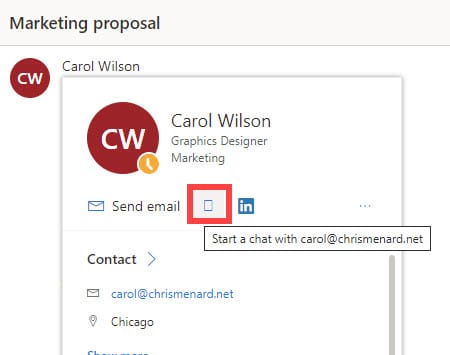 Email is great, but sometimes you just want to chat with someone. You can easily start a Teams chat by hovering over the name of the person and then clicking **Start a chat**. Teams chat window will appear and you can start chatting.