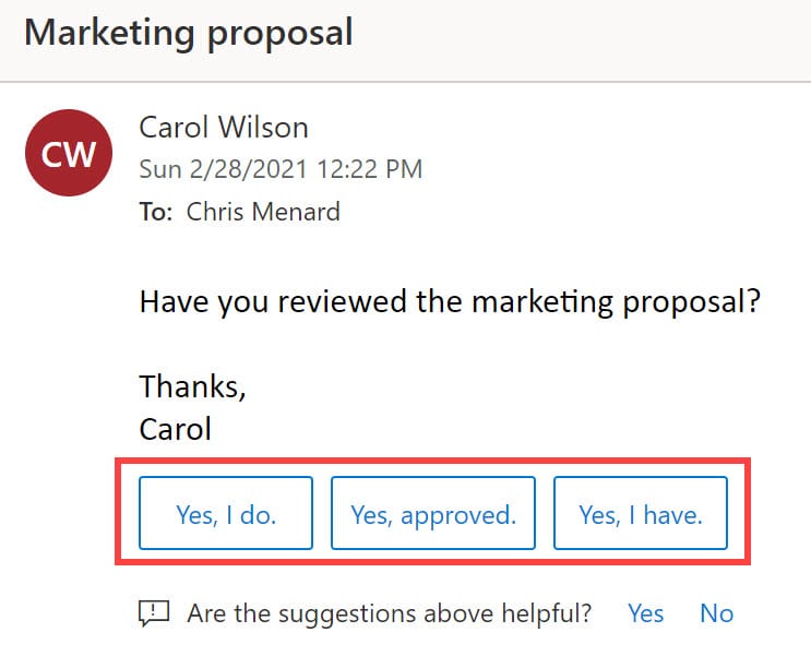 When you receive an email that you can answer with a short response, Outlook suggests _three_ responses that you can use to reply with a couple of clicks.