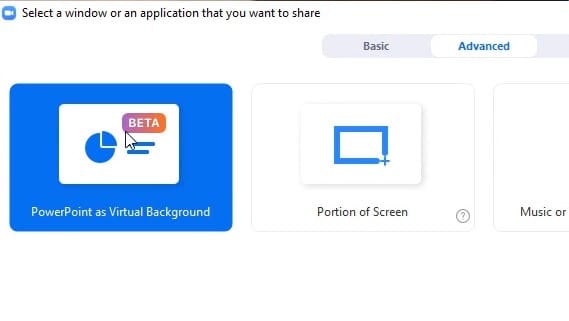 By default I am on **BASIC**, so I want to switch to **ADVANCED**. When I click on it there it is - **“PowerPoint as Virtual Background”**.