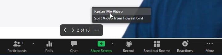 If I want to either resize or move my video over the presentation, I can click on the meeting control bar's dots and it says **Resize my video**.