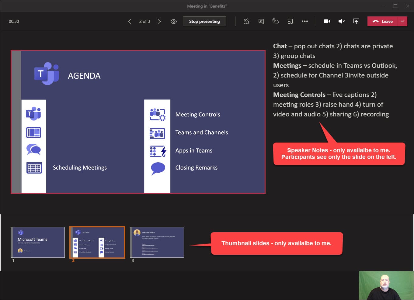 - The participants only see the current slide - They do not see your speaker notes - They do not see your slide thumbnails