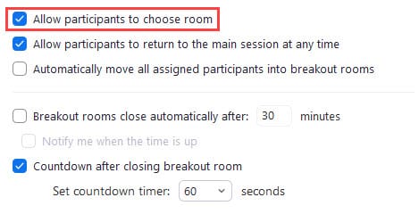- You can allow participants to return to the main session at any time - Automatically move all assigned participants into breakout rooms - Set a time for Breakout rooms to close automatically - Use a countdown timer for closing the breakout rooms