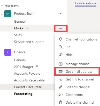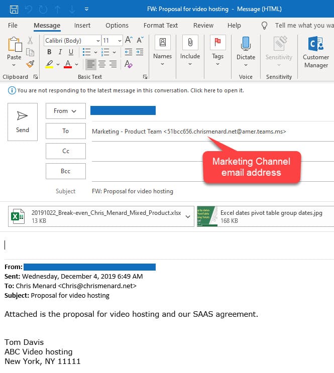 You received a quote with attachments by email from a vendor that the Marketing Team needs to review. You have a channel in the Marketing Team named Vendor Quotes. After emailing the quote to the channel, the Marketing Team can have a conversation about the quote. All the attachments are in the Files tab for the channel.