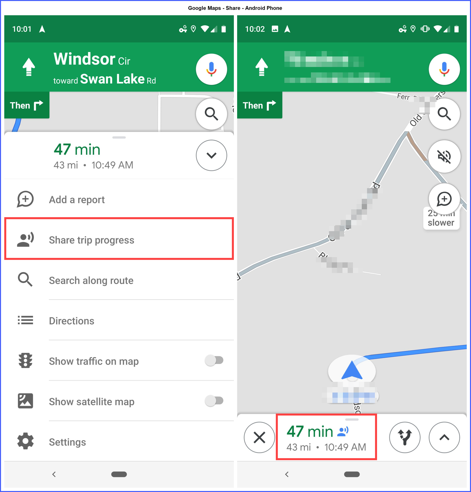 1. Open the Google Maps app Maps. 2. Set a driving destination. 3. After you start navigation, tap **More** and then **Share trip progress**. 4. Choose a person from the list. 5. Tap **Share.**