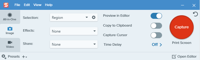 **Step 1** \- Open the the **Snagit capture window,** and while it is set on **Image.** I can either use the PrintScreen key or the big red **Capture** button.
