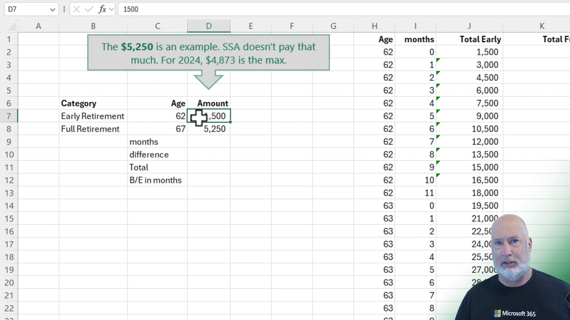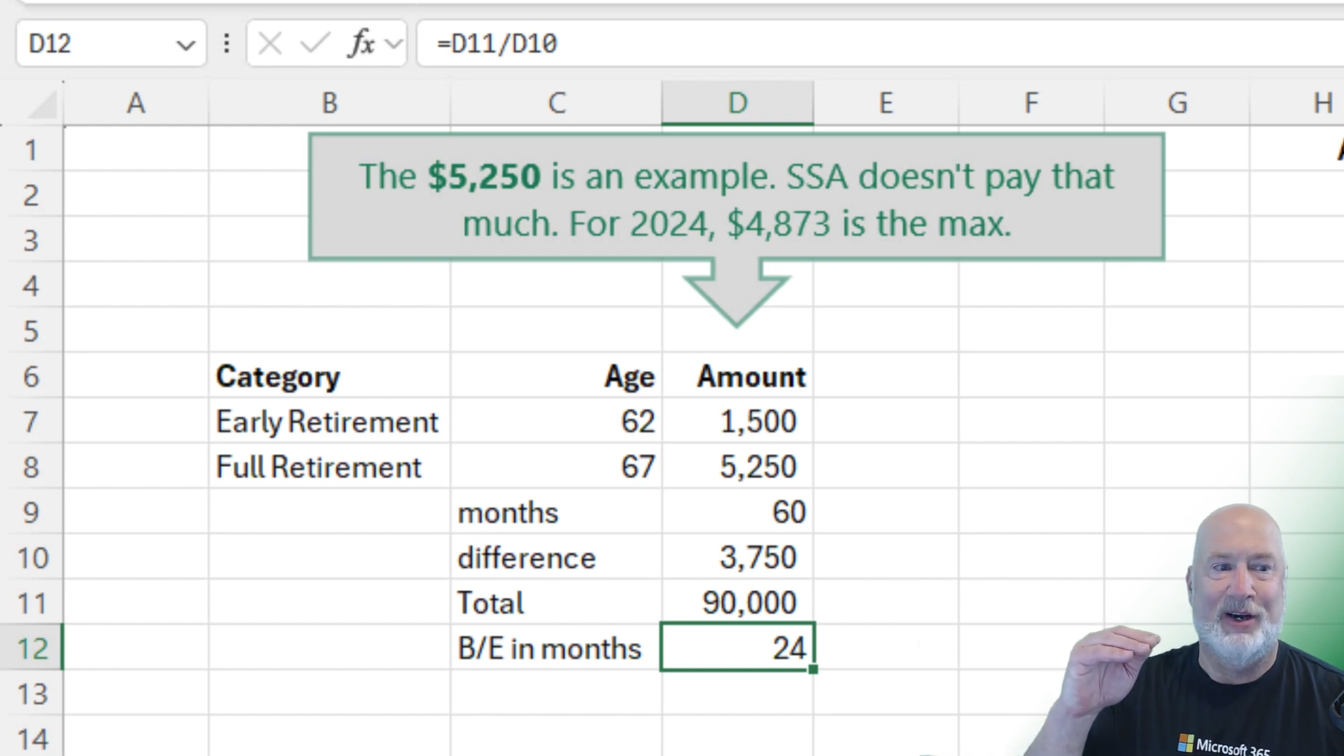 The first example is for illustration purposes only. In 2024, the maximum monthly benefit amount if you retire at age 70 is $4,873 ($58,476 annually). I used 5,250 to get a whole number in my calculation.