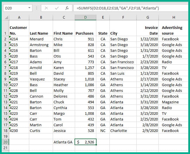 This would find purchases for Atlanta, GA customers. The SUMIFS function requires the purchases or values, followed by the criteria range and critera. The first criteria range is States with "GA" in quotes. The second criteria range is CITY with "Atlanta" in quotes.