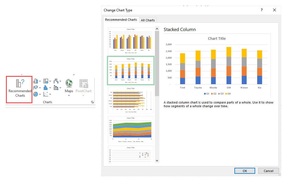 1. Select the data to chart 2. Click the **insert** tab 3. Click **Recommended Charts -** screenshot above 4. Select a chart to preview the chart 5. Click **OK**