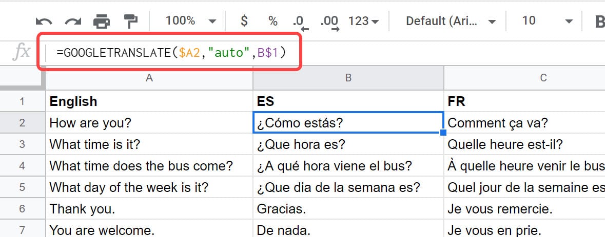 Translate languages in Google Sheets with GOOGLETRANSLATE function