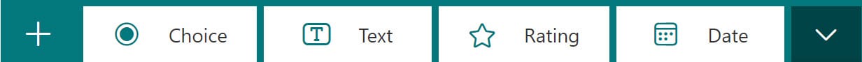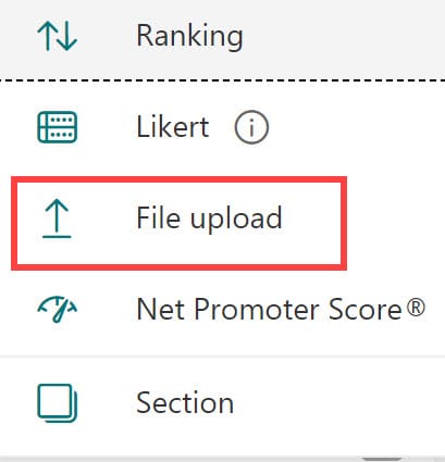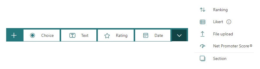 01. Single choice or true/false 02. Multiple answers 03. Short Text or Answer 04. Long Answer 05. Rating 06. Date 07. Ranking 08. Likert 09. File upload 10. Net Promoter Score