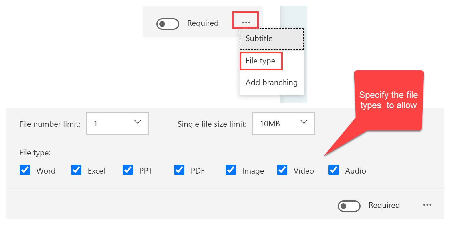 You can limit the number of files that can be uploaded between 1 and 10. The file size limit can be set at 10MB, 100MB, or 1GB per single file. The file upload question can also be set as "required".