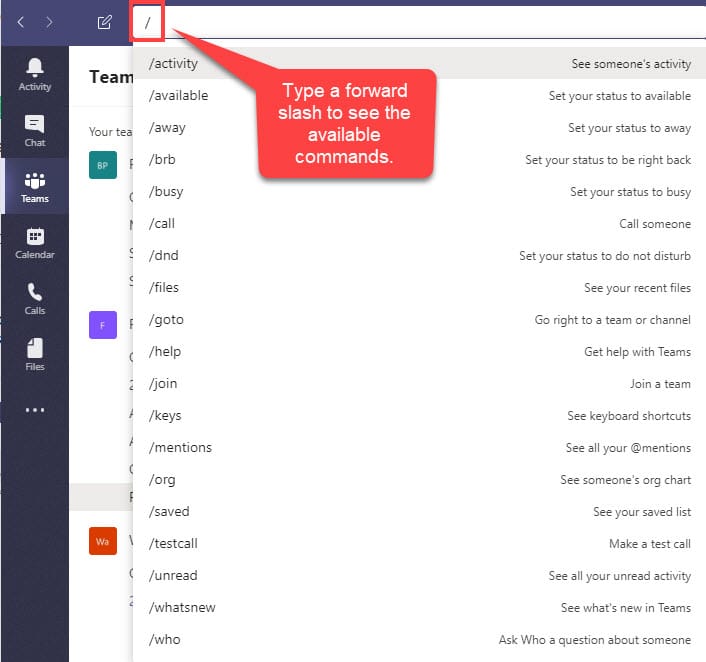 | Command | What it does | | — | — | | /activity | See someone's activity | | /available | Set your status to available | | /away | Set your status to away | | /busy | Set your status to busy. | | /call | Call a phone number or Teams contact. | | /dnd | Set your status to do not disturb. | | /files | See your recent files. | | /goto | Go right to a team or channel. | | /help | Get help with Teams | | /keys | See keyboard shortcuts. | | /mentions | See all your @mentions. | | /org | See someone's org chart. | | /saved | See your saved messages. | | /testcall | Check your call quality. | | /unread | See all your unread activity. | | /whatsnew | See what's new in Teams. | | /who | Ask Who a question about someone. | | /wiki | Add a quick note. |