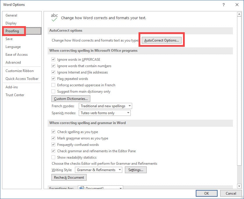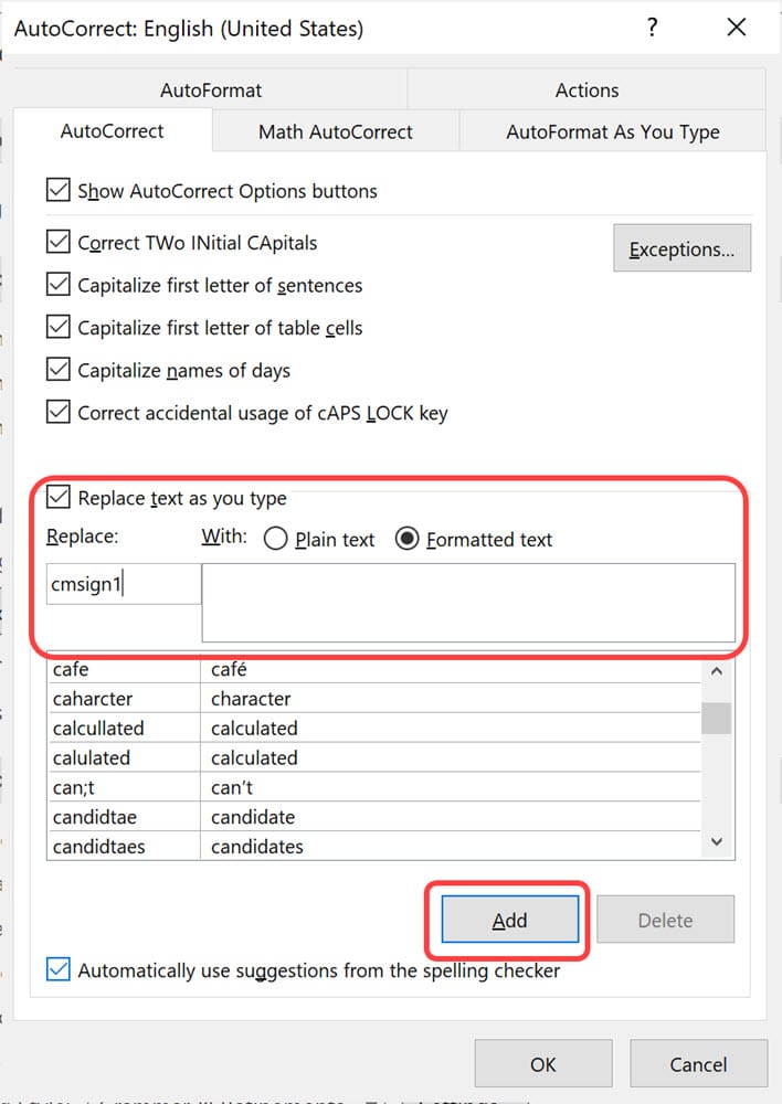 01. Insert the signature into Word. 02. Ensure the signature is selected and formatted the way you want using resizing and wrapping if needed 03. Click **File** then **Options**. 04. Click **Proofing** on the left 05. Click **AutoCorrect Options..** 06. In the **Replace** box, type in a name for your signature. I use lowercase when I do this. In my example, I typed in cmsign1. 07. In the **With** box, select **Formatted Text.** 08. **Click Add** 09. Click **OK** 10. Click **OK**