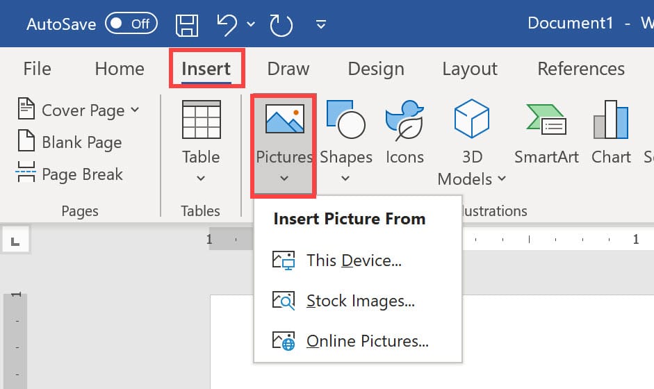 1. Click the **Insert** Tab 2. Select **Pictures**, click **This Device**. You can also use Stock Images and Online Pictures, but it will most likely be This Device for signatures. 3. Resize and change the wrapping if needed.