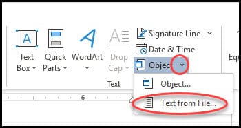 3. Add or combine the next Word document by selecting the **Insert** tab - clicking the **drop-down arrow** in Object in the Text group and selecting **Text from File**.