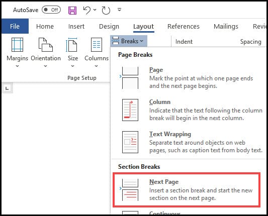 1. Have one Word document open. 2. Insert a Section break next page by clicking the **Layout** tab - Breaks - and selecting **Section Break Next Page**.